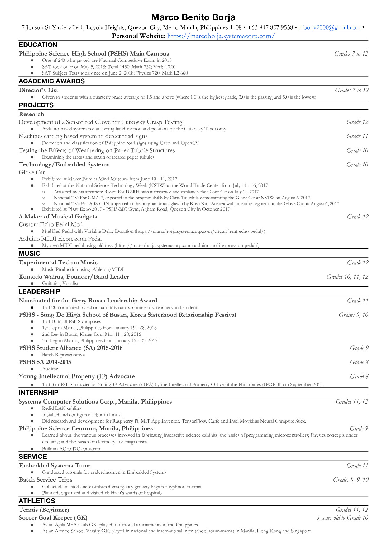 About Marco Benito BorjaQuezon City, Metro Manila, PHILIPPINESEmail: mborja2000@gmail.comMobile: +63 949 570 9448 One Page Resume